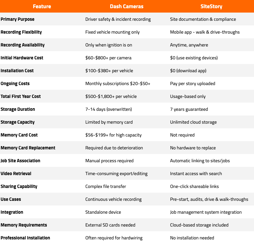 When it comes to recording video documentation for temporary traffic management sites, some companies rely on traditional dash cameras. While dash cameras serve their intended purpose for driver safety, they fall short when it comes to comprehensive site compliance documentation. SiteStory offers a purpose-built solution that transforms how traffic management companies capture, store, and share critical site documentation.